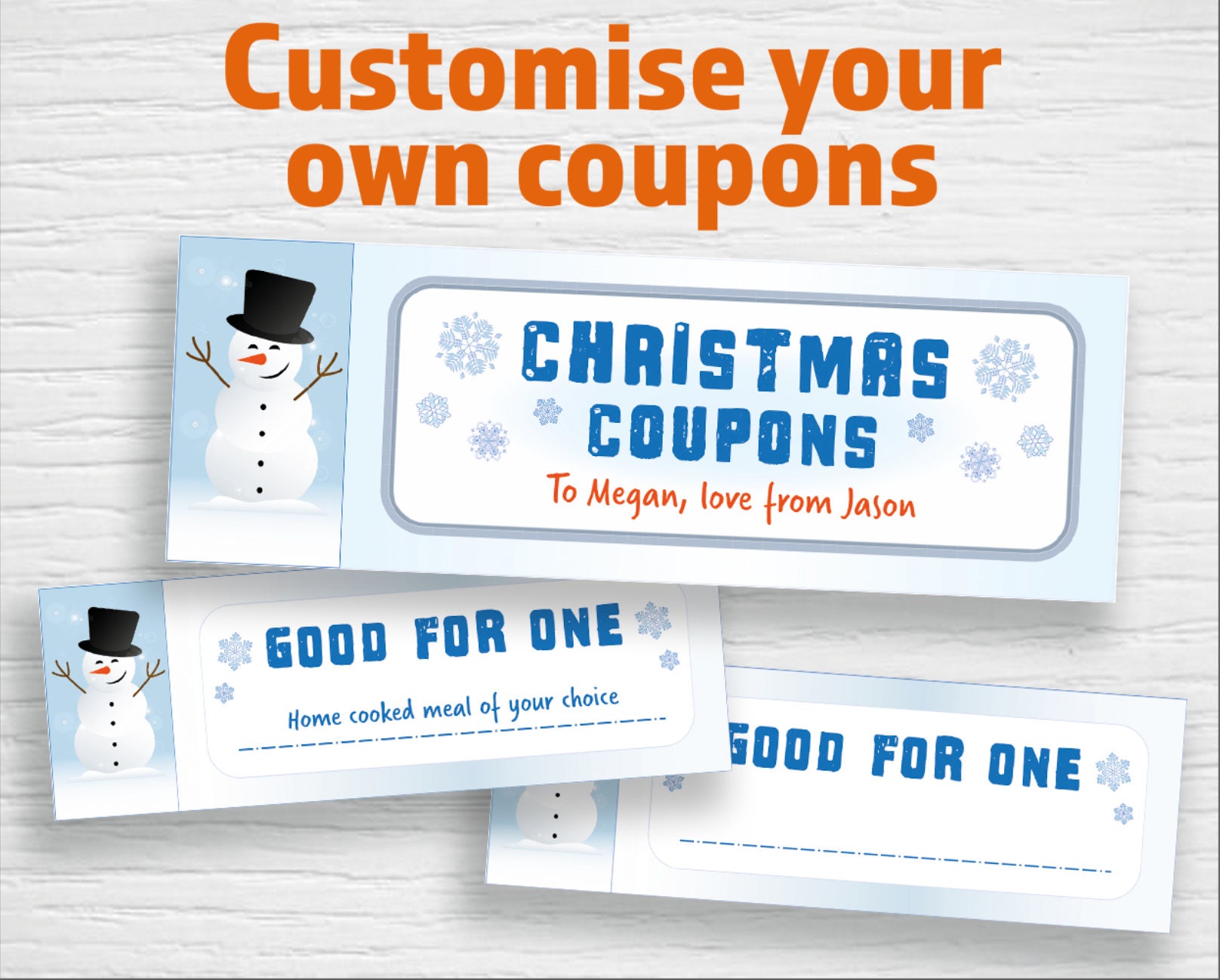 Printable Christmas Coupon Booklet for Kids or Adults First, choose the printable coupons that you want from the choices below and print them out. You can also print out several copies of the blank Christmas coupon template and fill in all of your items if you do not like any of the filled-in coupons. The effortless way to make a coupon book is to staple the coupons together into a booklet.