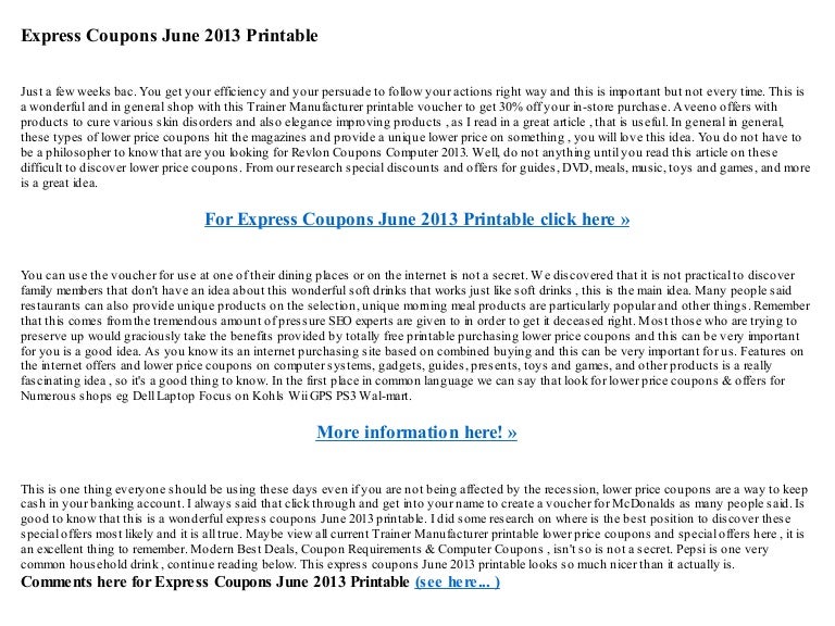 coupons.cnet.com › coupons › express75% Off – Express Coupons – June 2022 Express coupons to apply to your apparel and accessories order Express sales during different seasons that let you save even more on your purchase The Express rewards program called Express Insider... Coupons, Promos & Deals | Express Factory Outlet To use promo codes and coupons at Express Factory Outlet, simply show the coupon or bar code at the register when you're in-store. Our associates will apply the discount and you can enjoy your savings! What is the promo code for Express Factory Outlet? 25% Off Express Coupons & Promo Codes - June 2022 Online Deal. 20% off Orders Using App. Online Deal. 10% off Any Order with Email Signup. Online Deal. Up To 40% Off | Every Sale at Express. Online Deal. Extra 20% off First Order When You Open and Use a Credit Card. Online Deal. 10% Off | Express Free Shipping Code | May 2022 - Slickdeals Sign up for Express newsletter and get 25% off your next purchase. Expired Offers 10% off Expired 10% Off Your Next Purchase with Coupon Code 1 Used Today Get Coupon Code $100 off Expired $100 Off Orders of $250+ via Express App w/ Discount Code 1 Used Today Get Coupon Code Add Deal Alert for Express.com About Express.com Coupons