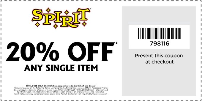 40% Off Spirit Halloween Coupons | October 2022 | U.S. News Check out the top Spirit Halloween Coupons for October 2022: 40% Off Spirit Halloween Promo Codes. Save on costumes, decor and more with Spirit Halloween coupons and deals.. 20% Off Spirit Halloween Coupons & Promo Codes - November 2022 Save with one of our top Spirit Halloween Coupons for November 2022: 20% Off. Discover 15 tested and verified Spirit Halloween Promo Codes, courtesy of Groupon.